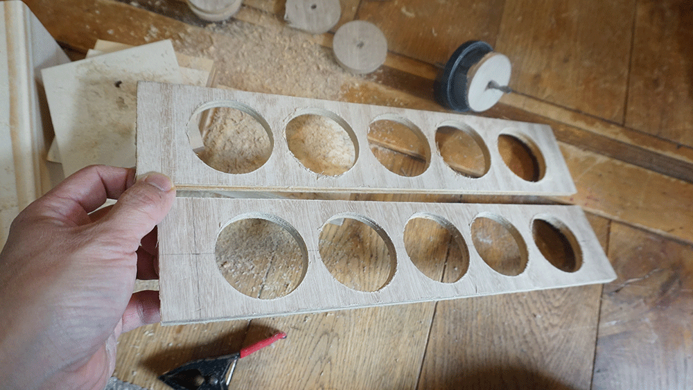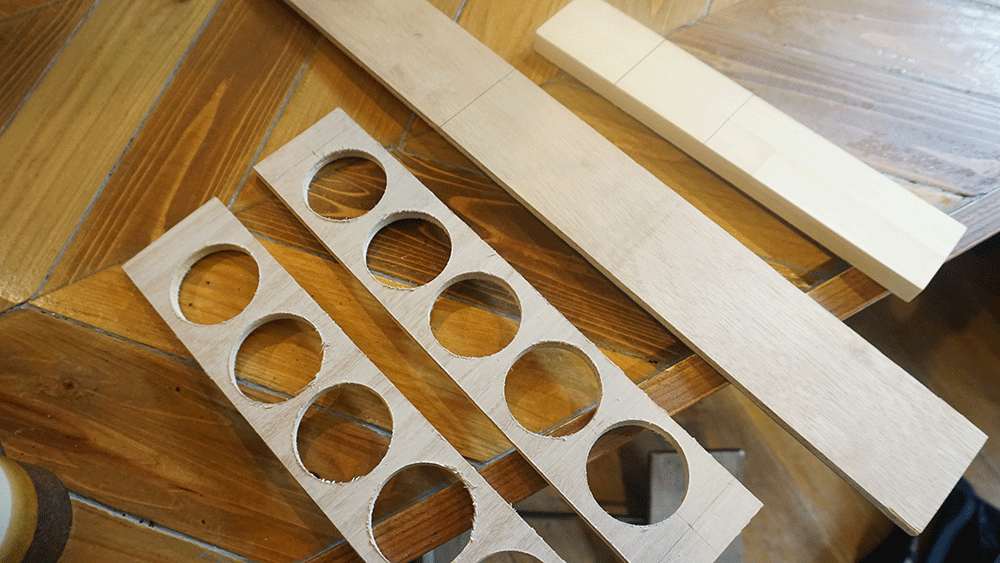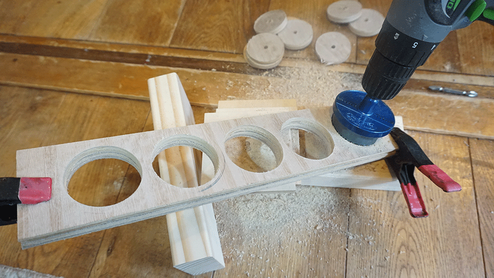 まずは厚みが4mmあるベニヤを2つ重ねて木工用ボンドでくっつけたものに、50mmのサークルソーで穴を開けていきます。