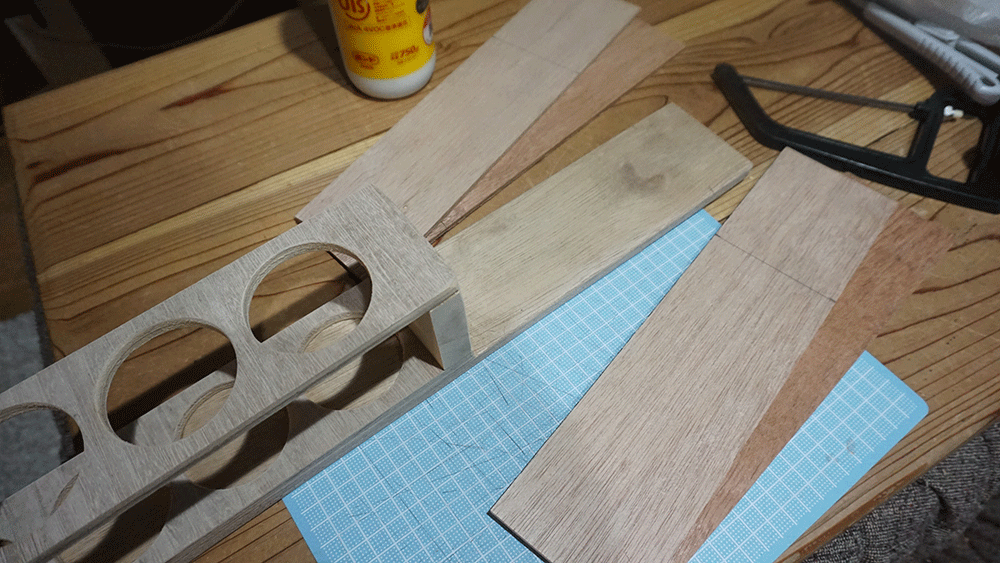 板はホームセンターによくある合板から切り出した板を、2枚重ねて木工用ボンドで付けて厚みを出したもの。