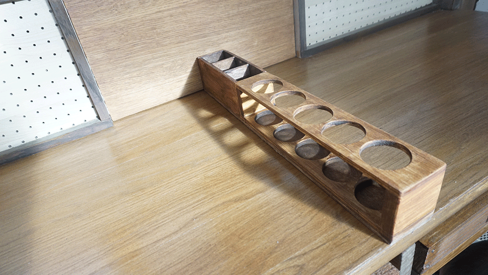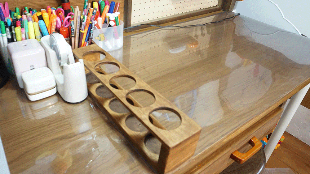 なのでその二つを繋いだ天板には、上の画像のように溝ができているので、これを隠すためにも機能的にも鉛筆たてを作ろうと思います。