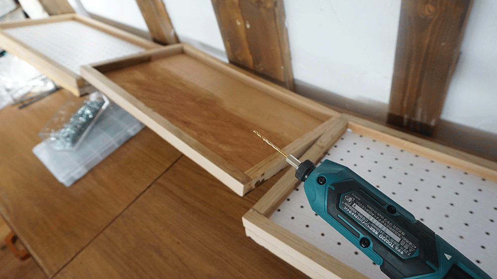 あと有孔ボードもちょっと色をつけようかと思ったのですが、表面にコーティング加工がしてあり、ステインやニスは色がのりませんでした。