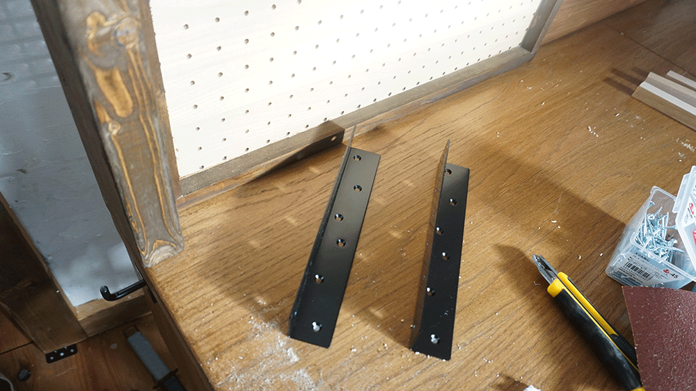 この三つの板をつないだら、2×4の柱で天板の奥の壁側に設置、アングルで固定します。