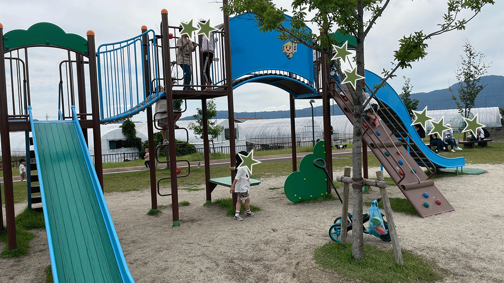 二つのすべり台に、アスレチック系の綱登りとミニボルダリング、雲梯。