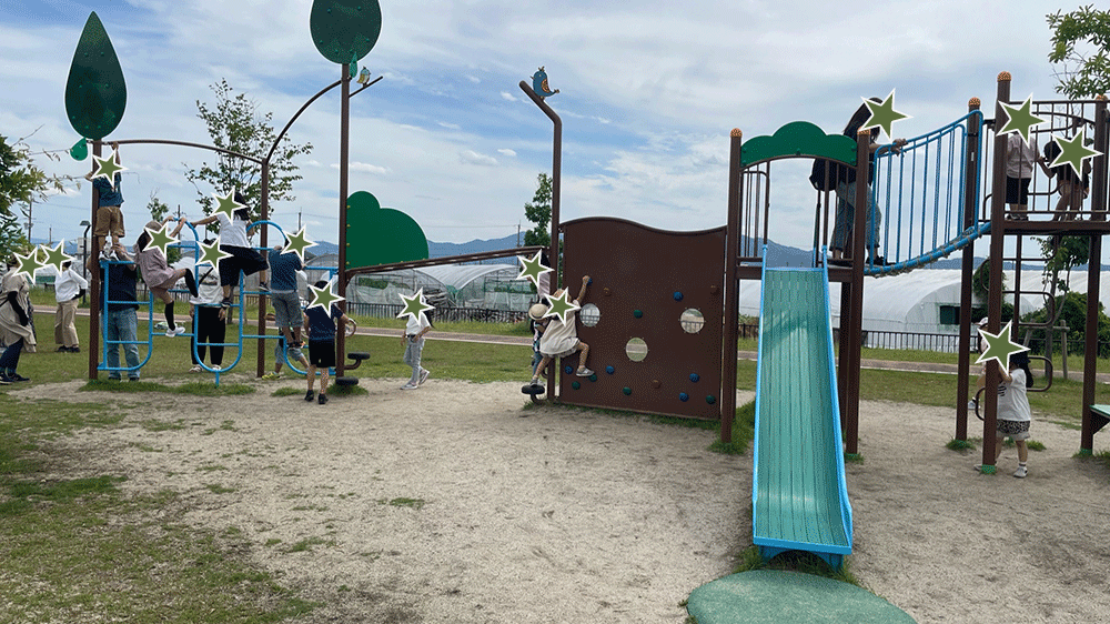 公園はその隣、手作り感満載の遊具が置かれ、子どもたちは思い思いの遊びを楽しめます。