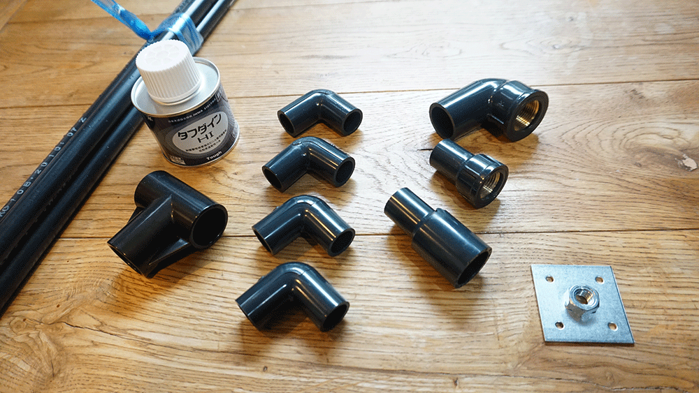 塩ビパイプたちと、タフダイン、土台プレート(名前わかりません)。