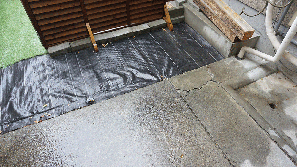 新しく購入した車が今の車よりも一回り大きく、駐車場を延長(黒い防草シートのある部分)しラティスをその分人工芝のある庭部分へ後退させたので、