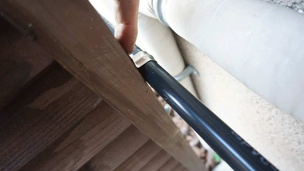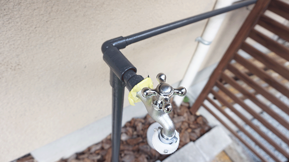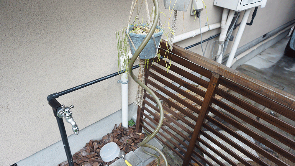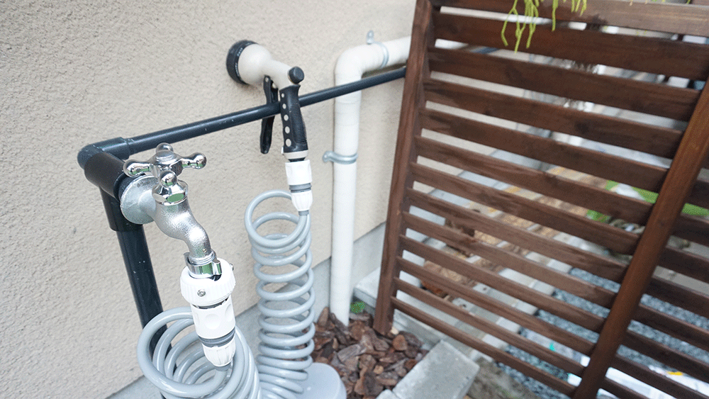 塩ビ管にホースを通すことで見た目だけでなく、太陽光からもホースをガードできるので強度も増しました。