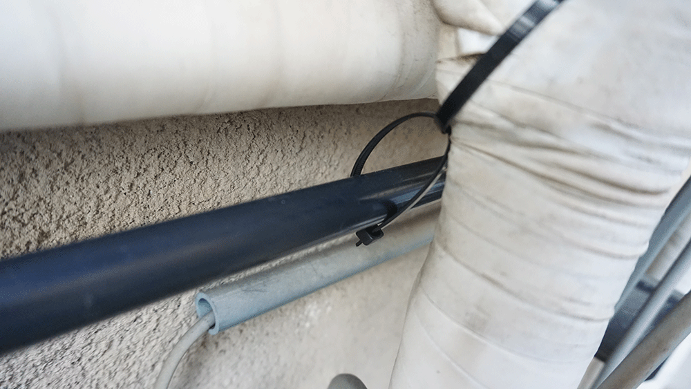 前の作業が無駄にならないよう、作った塩ビパイプの上に沿うように新しいパイプをセット、二つを結束バンドなどで固定します。