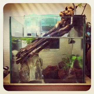 アクアスカイ。大小の流木が3つ、拾ってきた石が1つ、流木が水面からはみ出し、ちょっとしたテラリウム部分もあります。