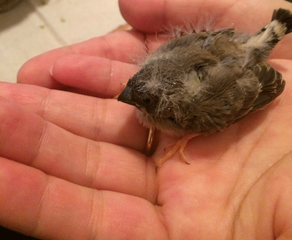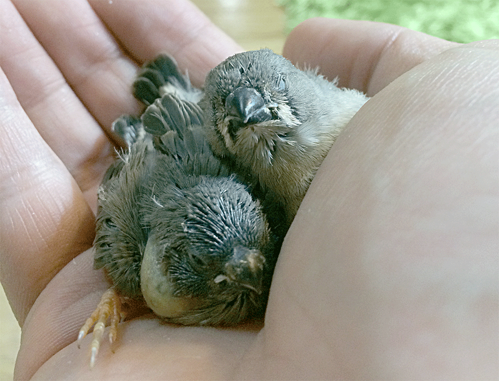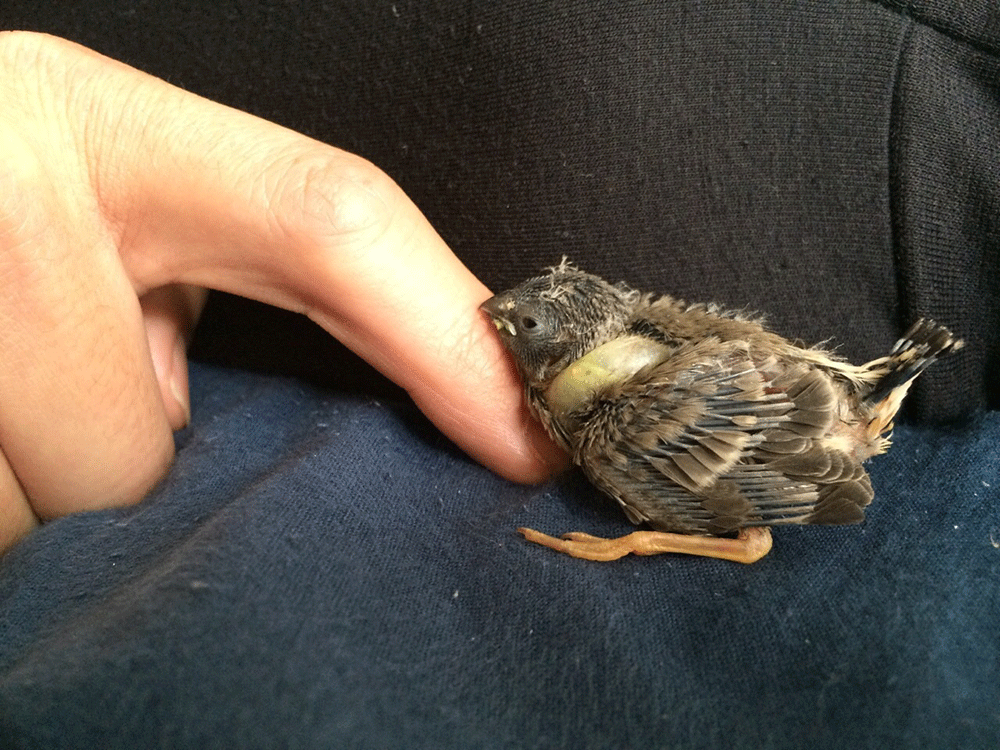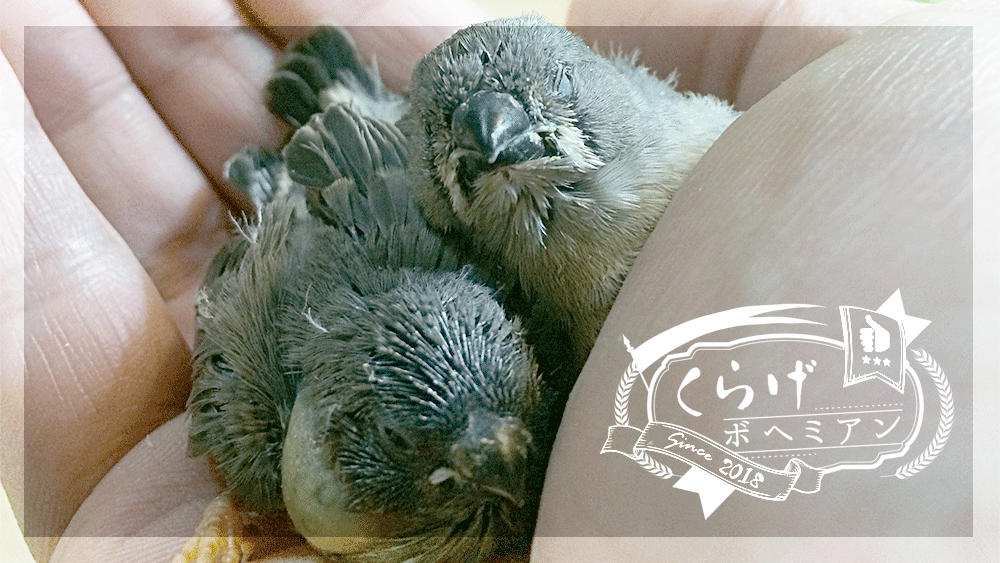 手に乗せてもあまり嫌がりません。あまり動けないからというのもありますが、目がやっと見え始めた頃なのでそんなに人間にも抵抗がないのかもしれません。錦花鳥は成鳥でも小さいですが、ヒナはさらに小さく扱いに気が抜けません。