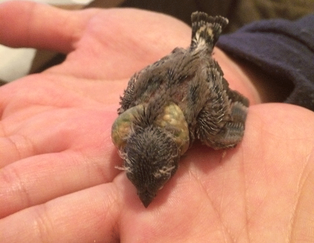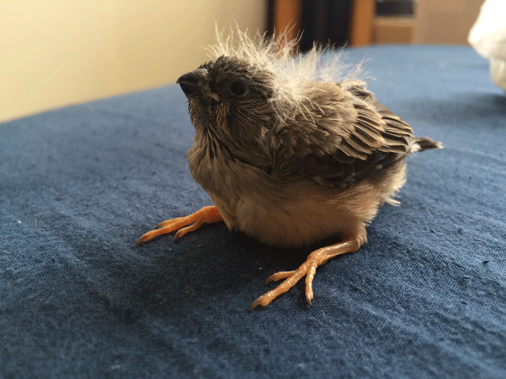 まだよちよち歩きしかできません。毛もアホ毛がたくさん付いています。でもすでに羽はしっかりと生えそろっていて、もう間もなく飛べそうなほど。