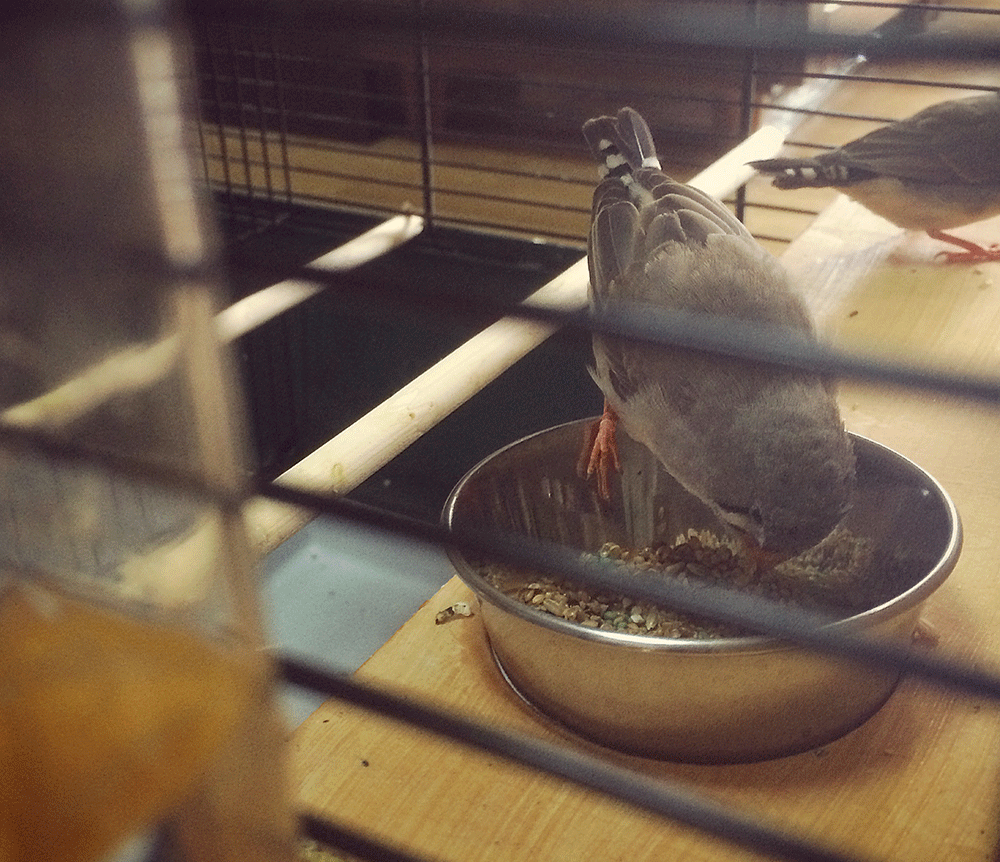 そのままゆっくり逃さないように家まで帰り、扉を閉めました。もう飛ぶ元気もないのかぐったりしていたので、急いでエサのあるケージに入れると無心でエサをつついていました。錦花鳥は一度にあまりたくさんの量を食べることはありませんが、5分間くらいずーっと食べていました。