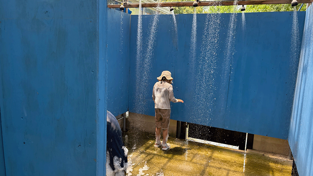 プールのそばの通路に向けてアワアワ装置から大量の泡が噴射されていました。