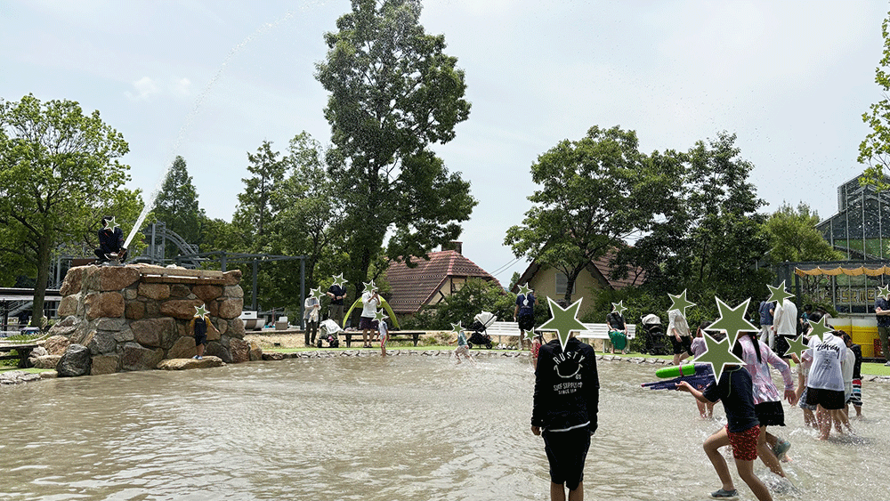 走り回ったり水鉄砲で遊んだり、と言う遊び方がメインで、そこまで広いわけではないので水遊びを楽しみにくる!という場所ではなく、プラスアルファで水遊びをする、くらいの感覚です。