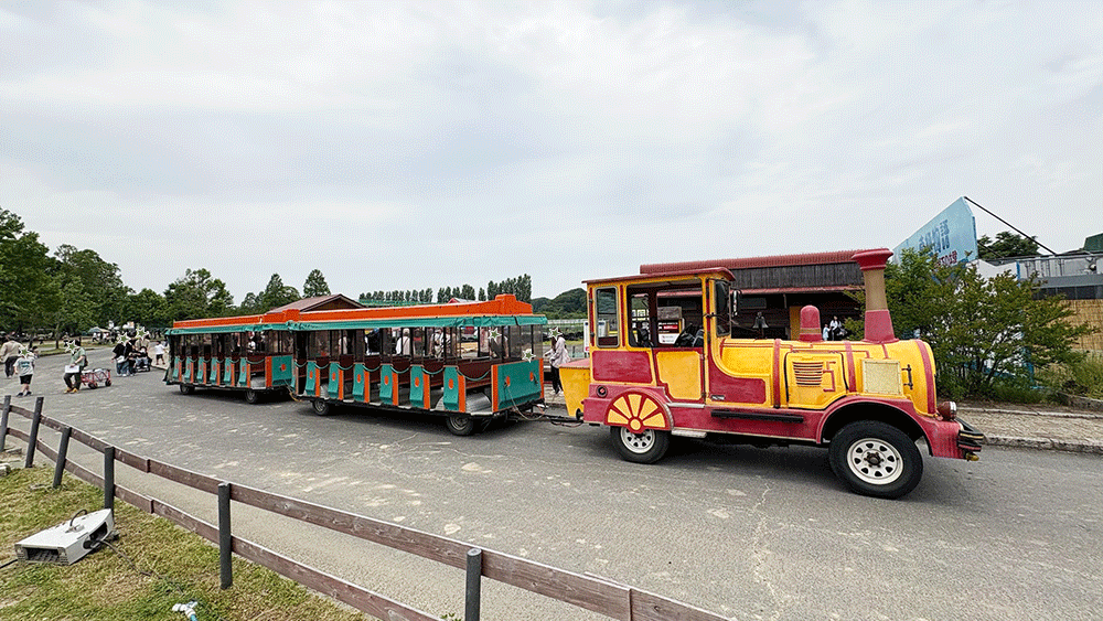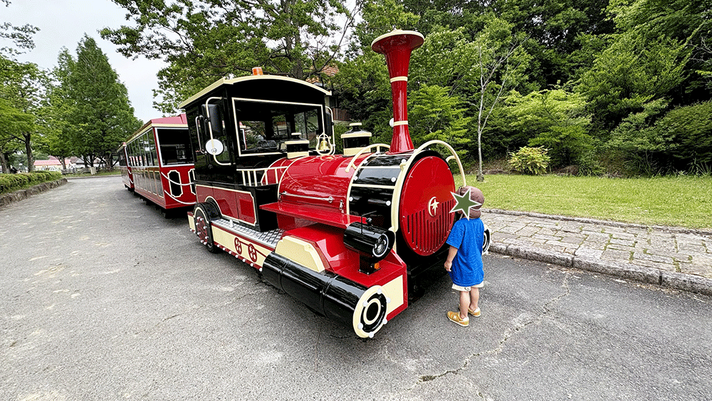 園内はこんな列車バスが走ってました。電車好きの息子が発狂してました。