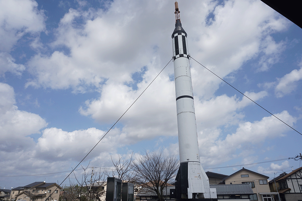 博物館が近づくと、大きなロケットが見えてきます。黒と白のシマシマ配色で派手なロケットは駐車場にそびえ立ち、子どものテンションも一気に上がります。