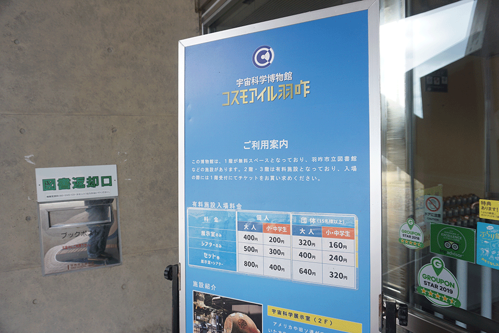 利用料金:展示室/大人400円、小中学生200円 コスモシアター/大人500円、小中学生300円 セット料金:大人800円、小中学生400円