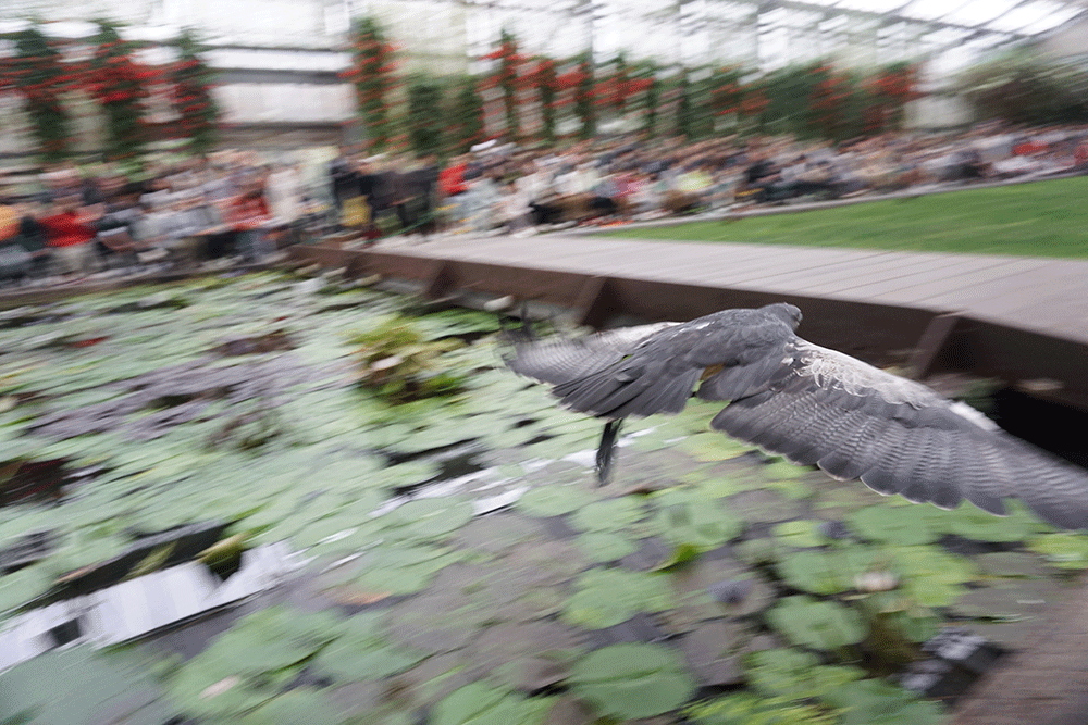鳥の登場は決まって会場の奥側。遠い場所から颯爽と現れます。
