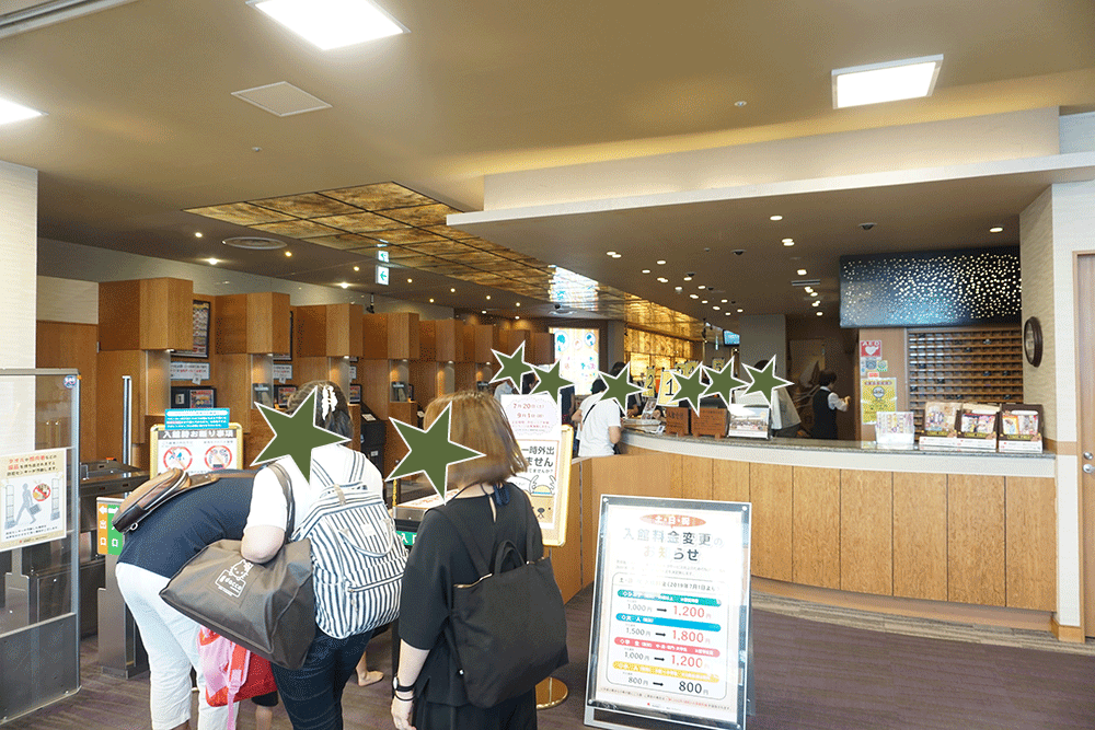 下駄箱に入れたら次は受付で鍵を受け取ります。鍵はお風呂のロッカーの鍵になっていて、精算機も付いているので場内で販売されているジュースなどのすべての商品はこの鍵で購入することができます。
