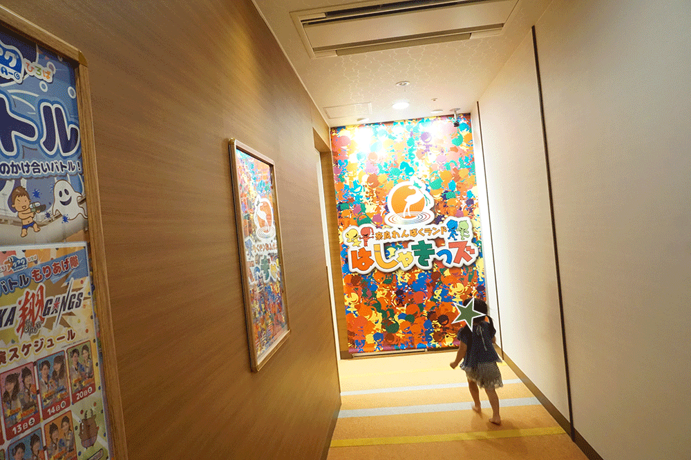 はしゃきっズを後にして長い通路を戻り、奈良健康ランドの受付の場所へ戻ります。
