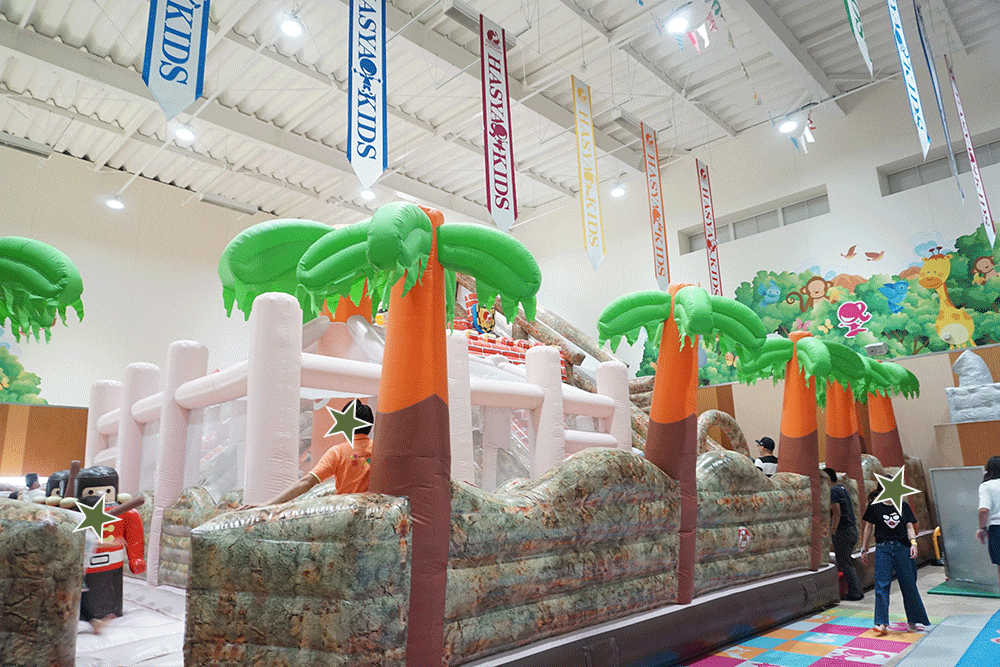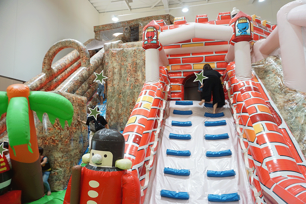 1番の目玉遊具、「はしゃきっズ・キャッスル」はこれまで見たこともなかった超巨大なエア遊具です。はしゃきっズのエリアのおよそ半分を占める大きさで、子どもはもちろん大人もとっても楽しいし遊具です。遊具というかもはや建物です、屋内エア建物。