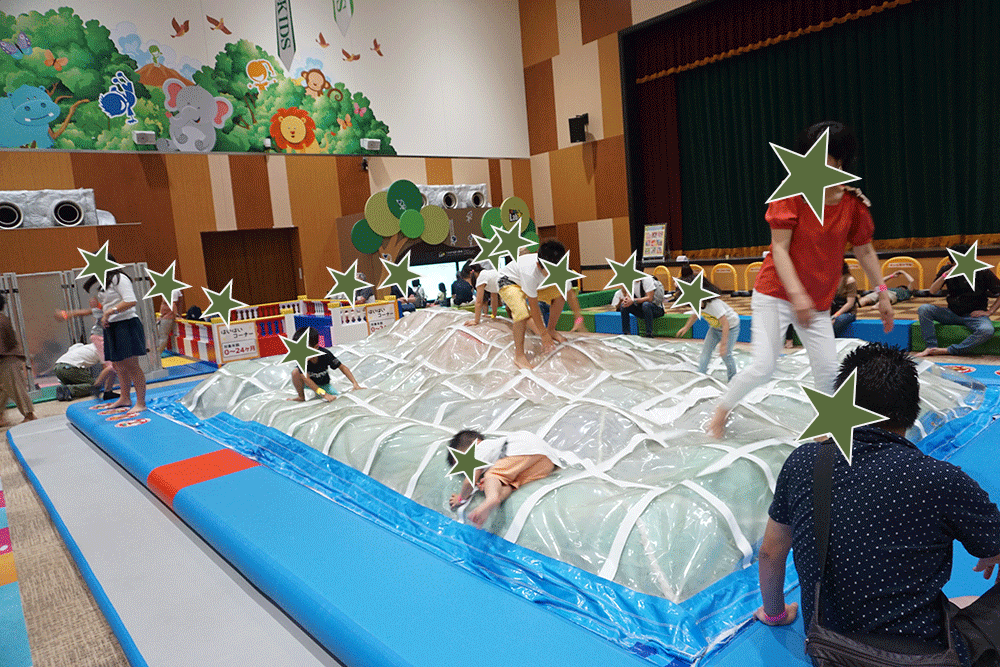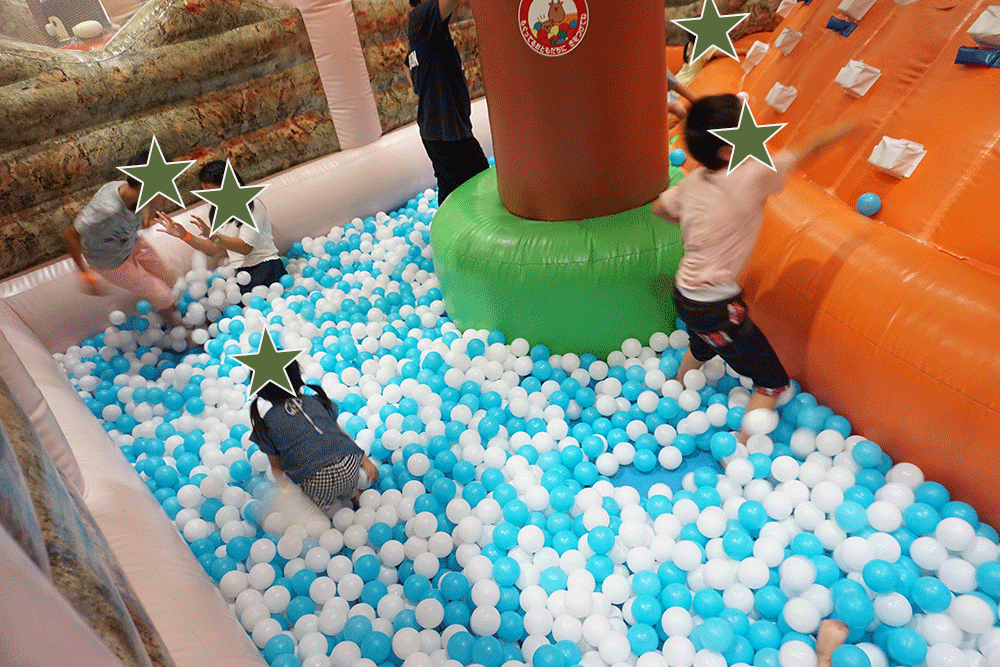 中には大きさの違うボールがたくさん並べられていてシートで覆われた遊具です。かなり大型なので子どもで溢れて遊べない、なんてこともなく安心して見ていられます。意外とバランスが取りにくいのでそのアンバランスさが楽しいです。