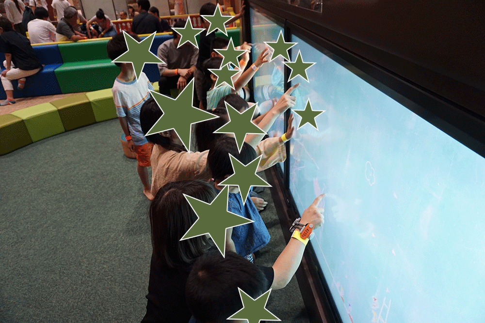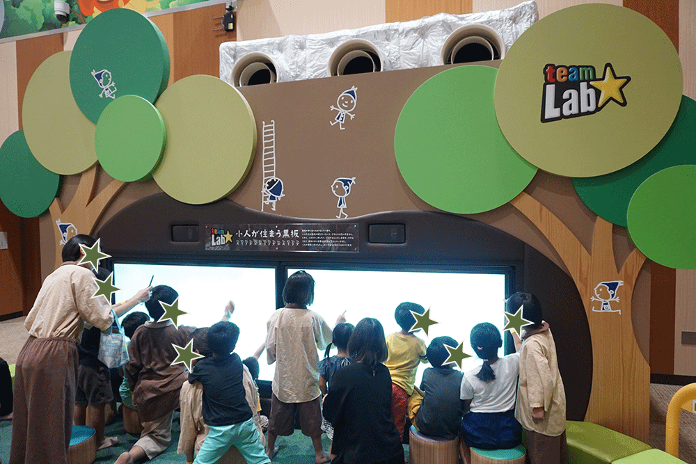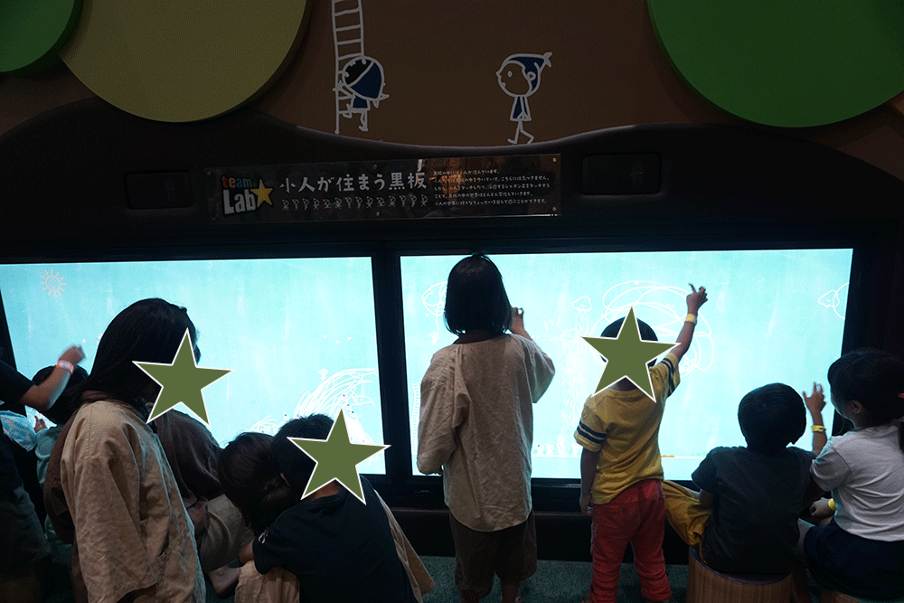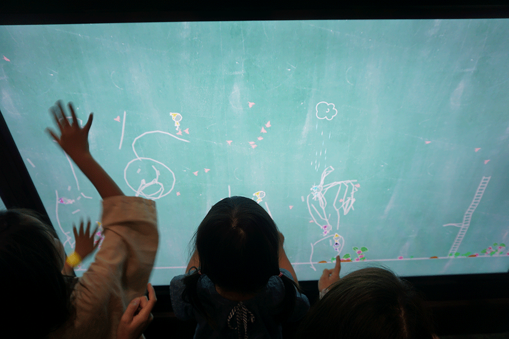 これは黒板の中を小人たちが動き回り、鳥が飛んだり雲が浮かんだり花が咲いたりといろんなことが起こる世界に、黒板にチョークで書くように手でタッチして干渉することができる不思議な遊具です。