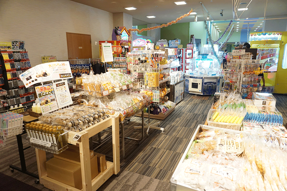 プールから出てほかの施設も散策してみます。温泉&プールの脱衣所がある出入り口の正面には売店があります。