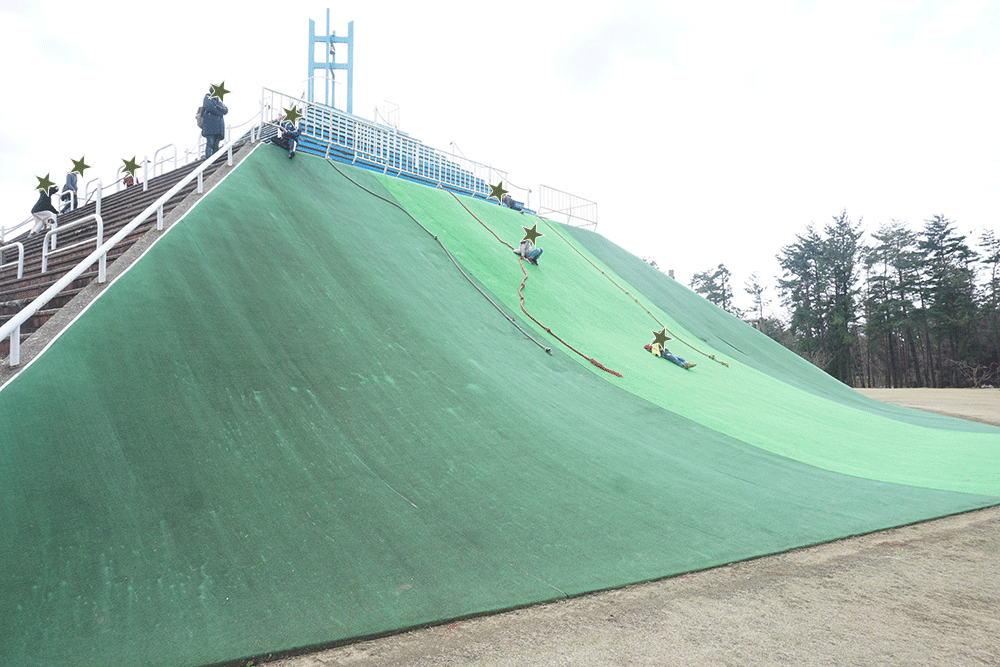 急斜面ですが、下へ行くにつれて緩やかになっているので、想定してるようなスピードは出ることはなく小さなお子様でも安心してすべれます。大人だと割とスピードが出るのではじめはちょっと怖い。