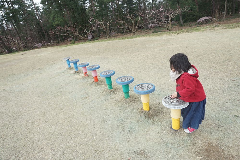 こちらの遊具は、乗るとマリオのキノコ型の道のようにググッと下へさがり降りると元の高さに戻ります。