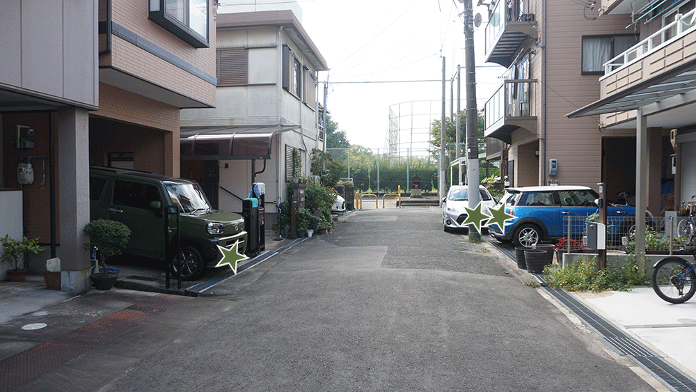 住宅街の先に公園への道が続いています。