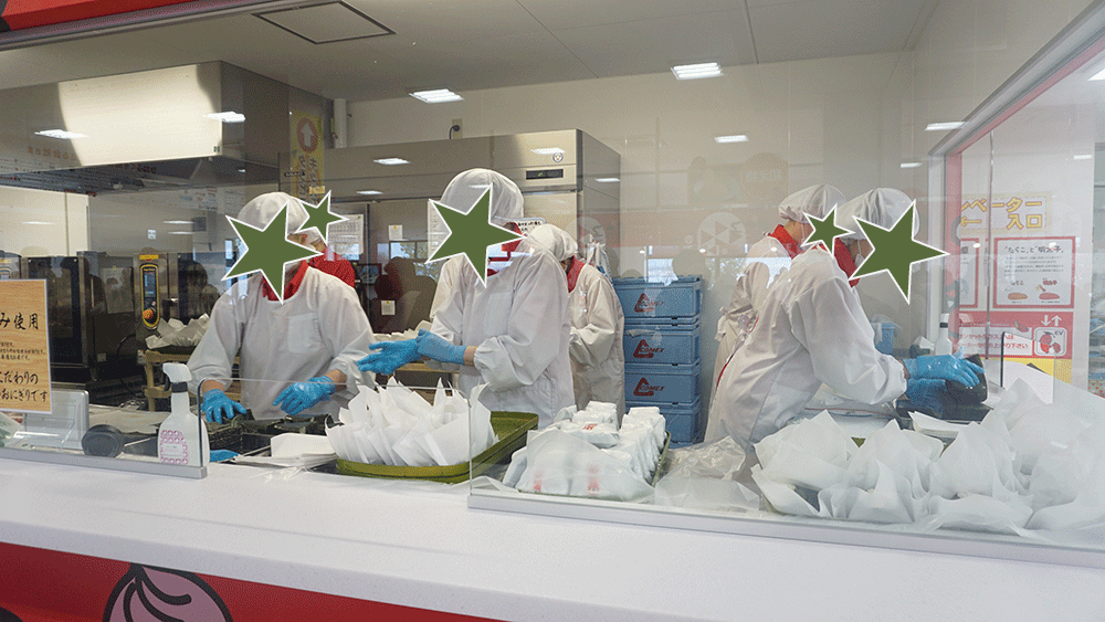 列に並んでいる途中に、おにぎりを詰めているところやたらこを焼いているところが見れます。