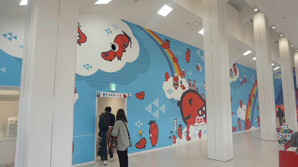 階段には明太子のキャラがお出迎え。