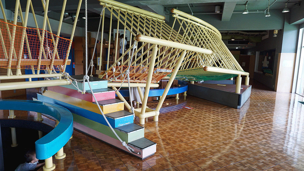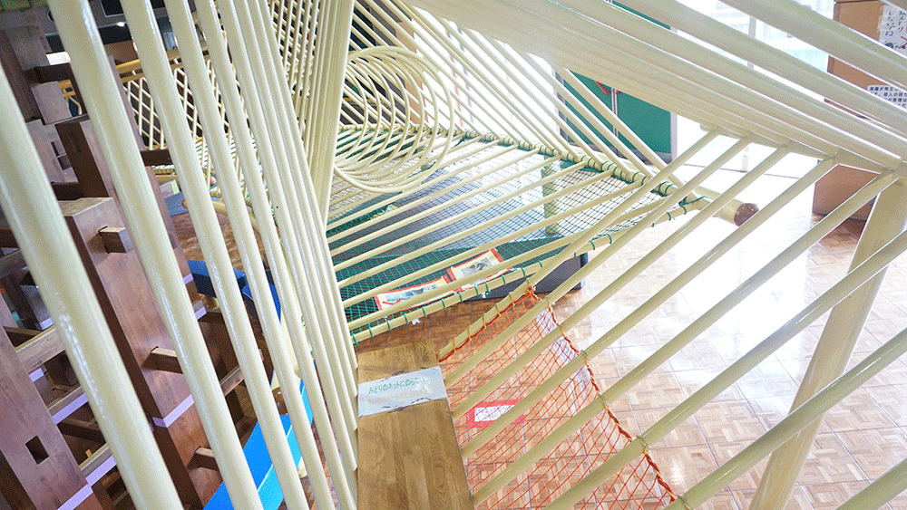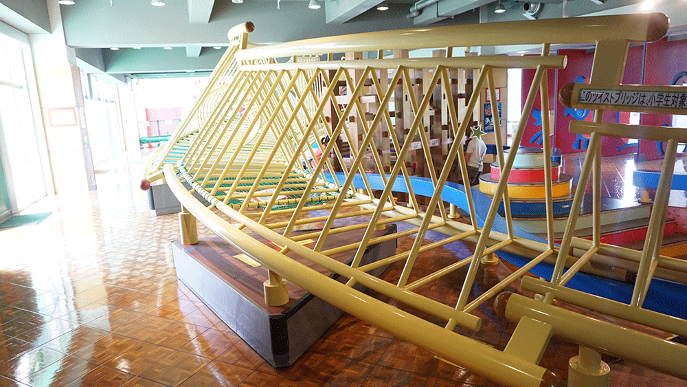 ツイストブリッジはこのプレイルームのメイン遊具。入口から一番奥まで続くアスレチックで、小学生が楽しめる遊具。