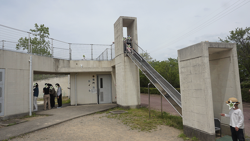 ジャングルジムの近くには手洗い蛇口があり、そこから北の建物へ進むとこちらにもまたトイレがあります。