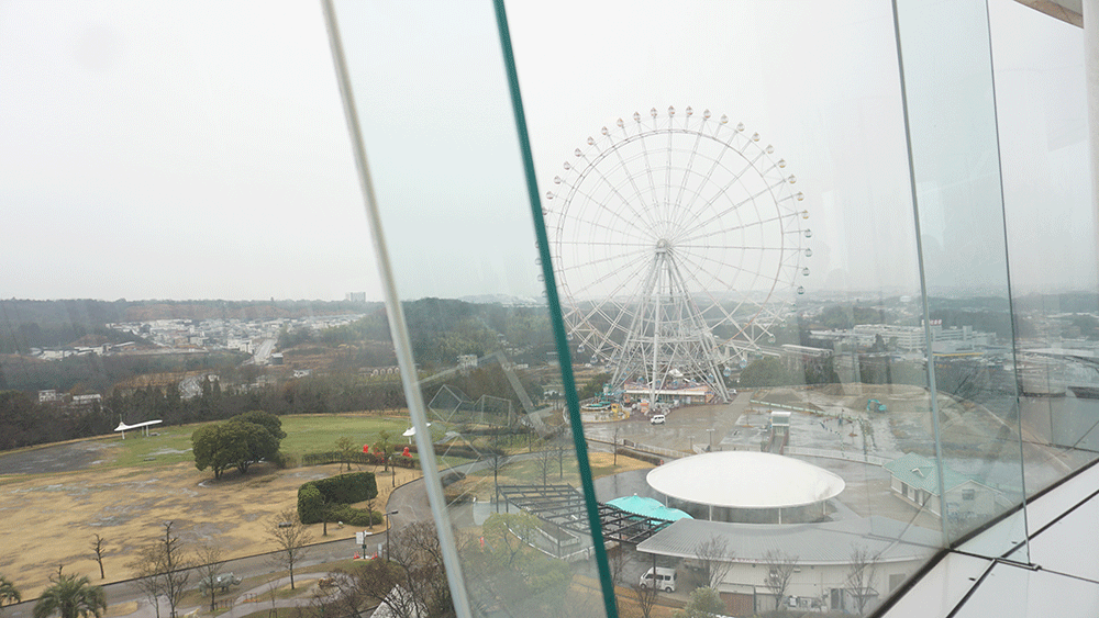 エレベーターの待合箇所からはジブリパークが見えました。遠くに見えるあれはたぶんハウルの動く城?