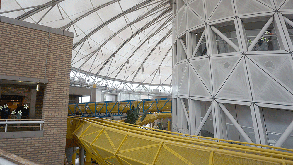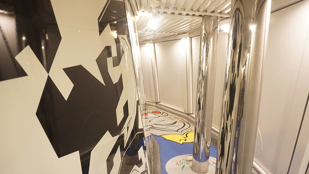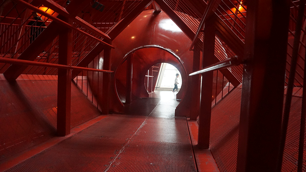 タワーの端にはスロープがありここから頂上目指して進んでいきますが、地面や壁の設計がめちゃくちゃで普通に歩くとすごく酔いそうになります。
