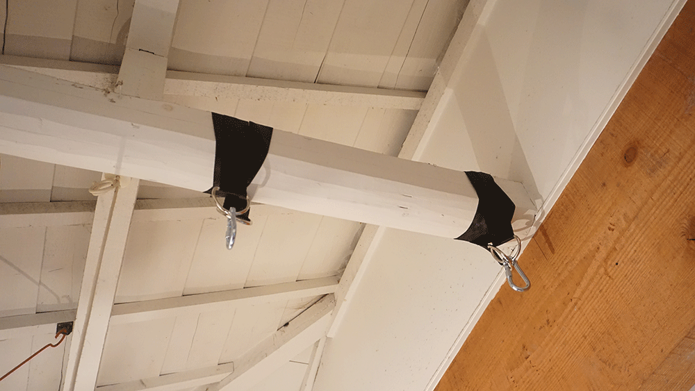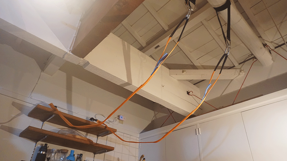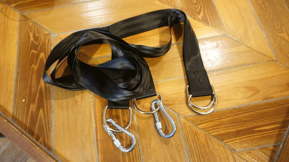ハンモックベルトではなく、吊る箇所に金具をつけてベルトスリングを通すだけの方がお気軽でいいのですが、大きな穴を空けていい場所がないのと、取り付け場所を気軽に変えられようハンモックベルトにしています。