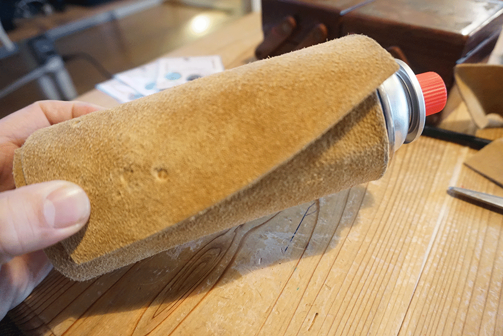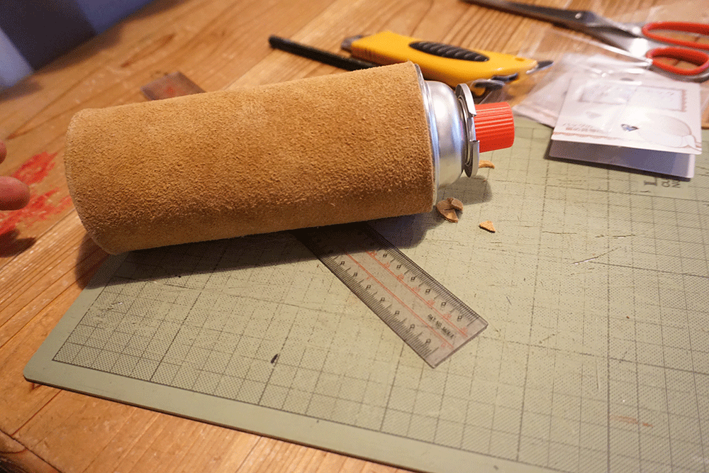 まずは革製品をボンベに合わせて切ります。