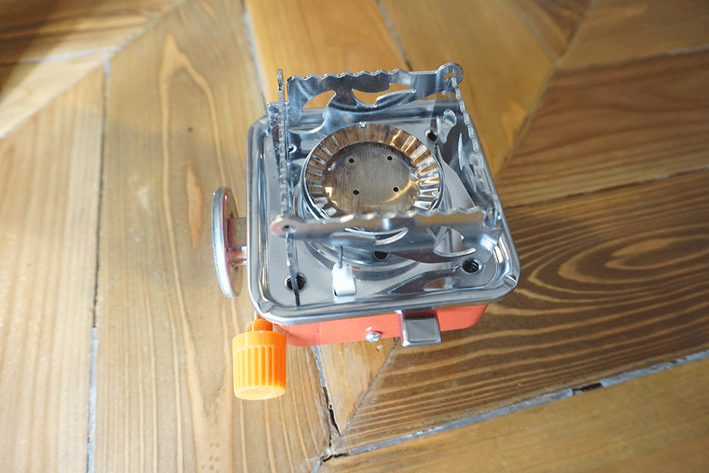 購入したミニコンロは、よくあるカセットコンロのように中に収納しながら使うのではなくカセットボンベ缶がむき出しになってしまうので、見た目にはあんまり…な印象。