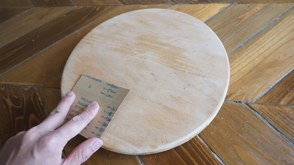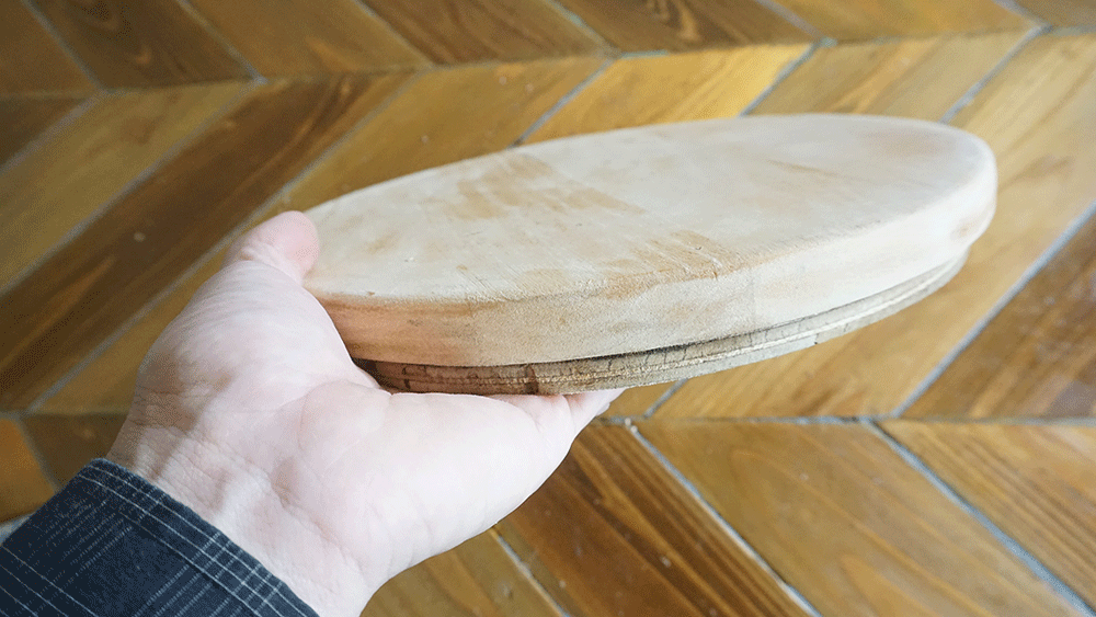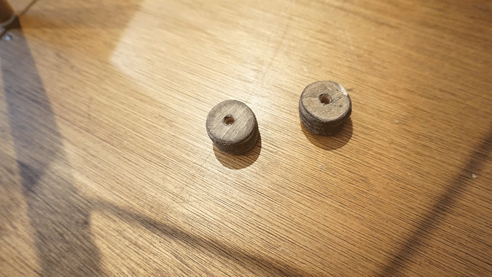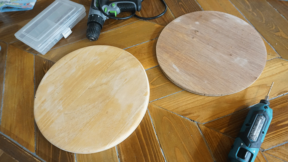 丸い木材がふたつ、いい感じのサイズのが余っていたので、これをまずは引っ付けて厚みを作ります。