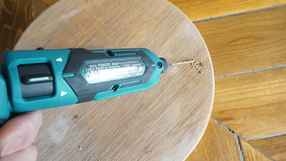 想像していたよりもかなり硬い、というより座面が回るようになっていたので、ドライバーで押し込もうとしてもくるくる回ってしまい穴を開けられず、ビスを止めることは断念しました。
