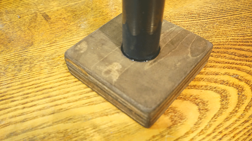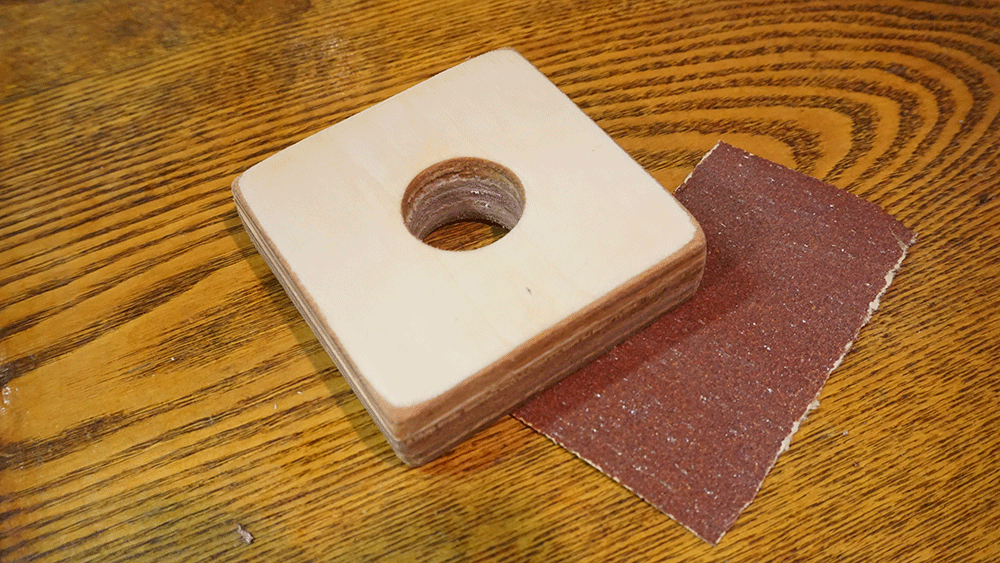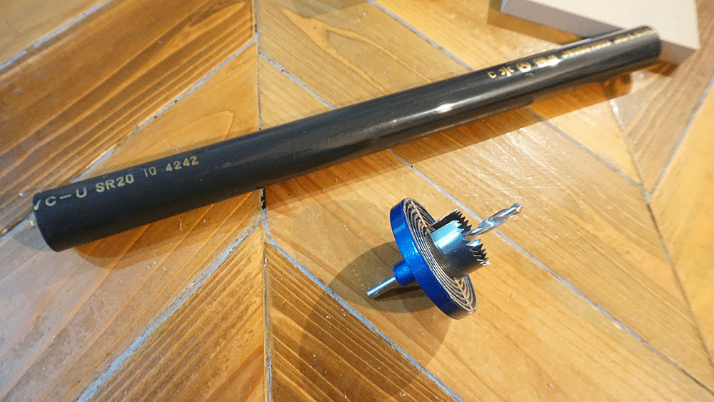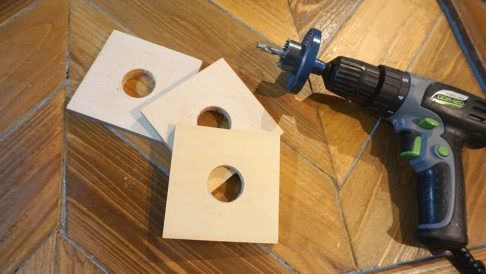 厚みのあるシナベニヤを3枚、水道管と同じ径で穴を開けます。