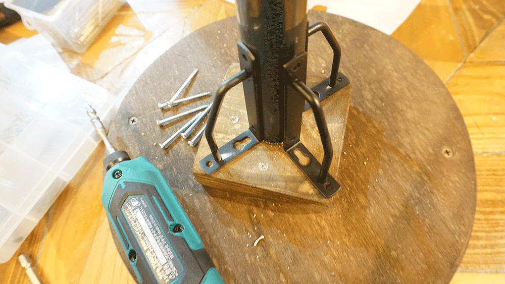 脚組をシートの裏側から太めのビスで留めます。留める前にした穴を開けてからビス留め。