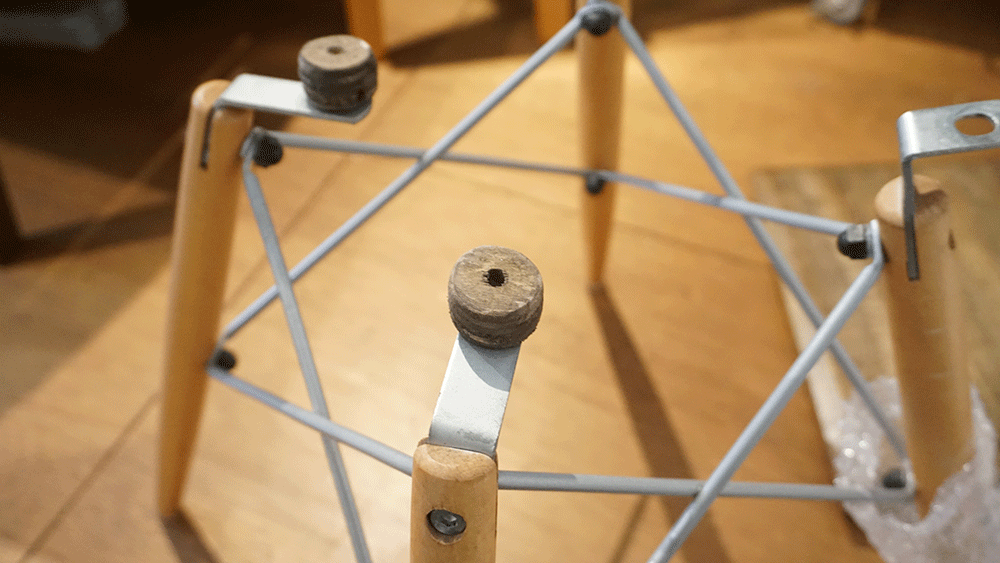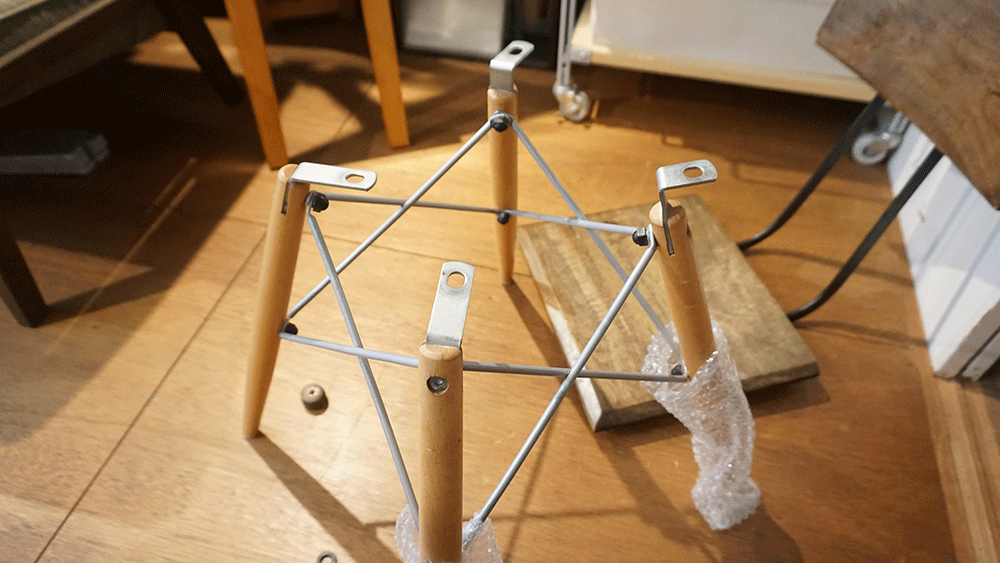 ひとつ目の椅子は、シート部分に脚を新しく取り付けます。