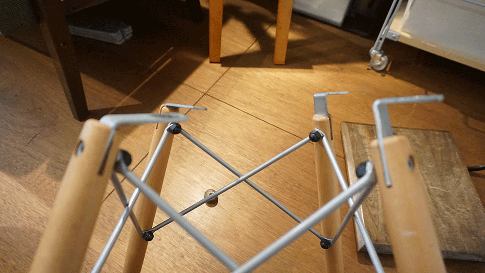 サクッと完成!と思ったらなんか角度がつきます、なるほど、椅子の形状に合わせて脚も角度がついている。