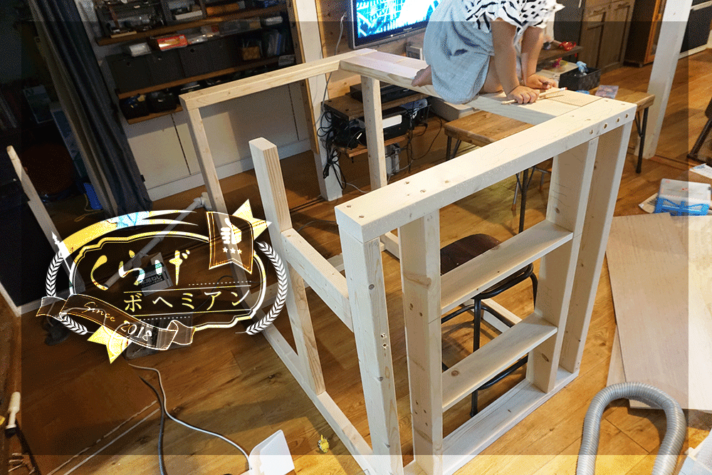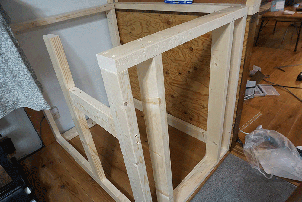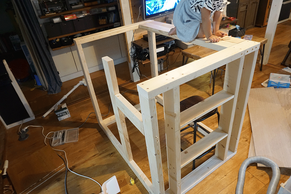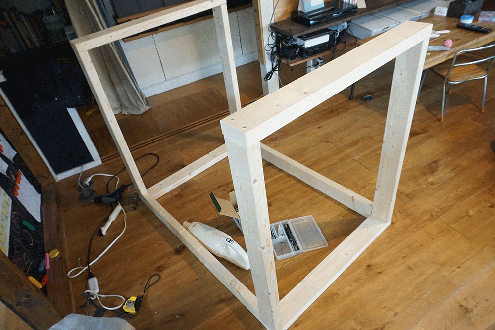 骨組みを建てていきます。子どもが上に乗れることを想定して2×4で組んでいきます。