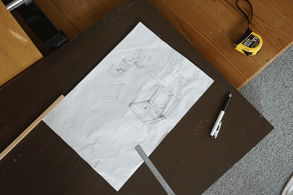 場所が決まったらラフスケッチと、寸法をしっかり測り高さや奥行きをメモっておきます。