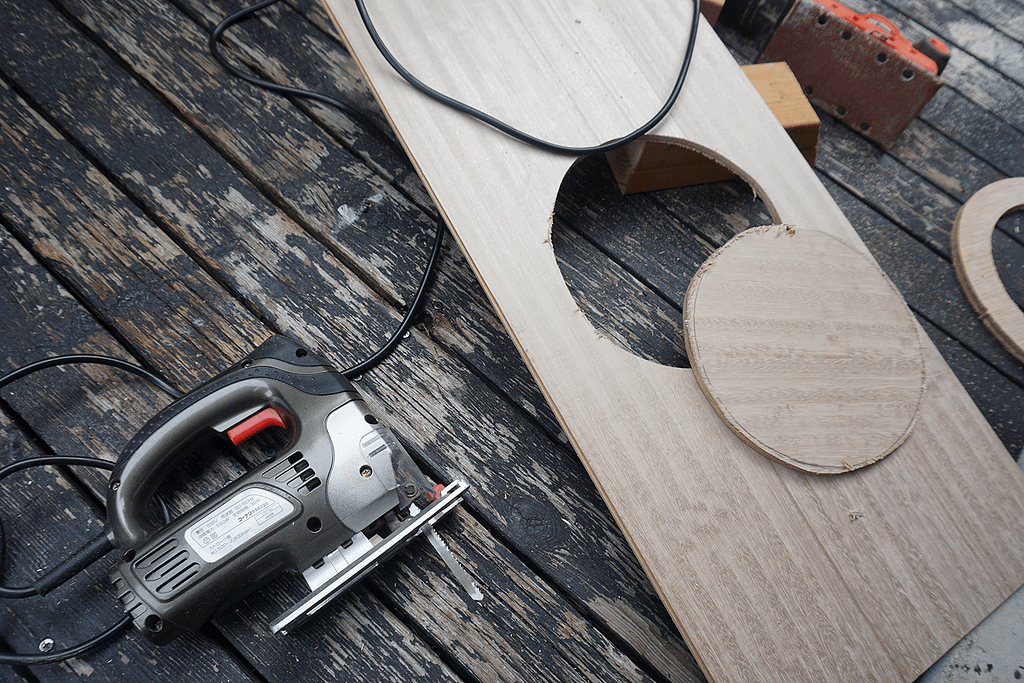 丸くくり抜くのは破壊音でおなじみトリマーで、