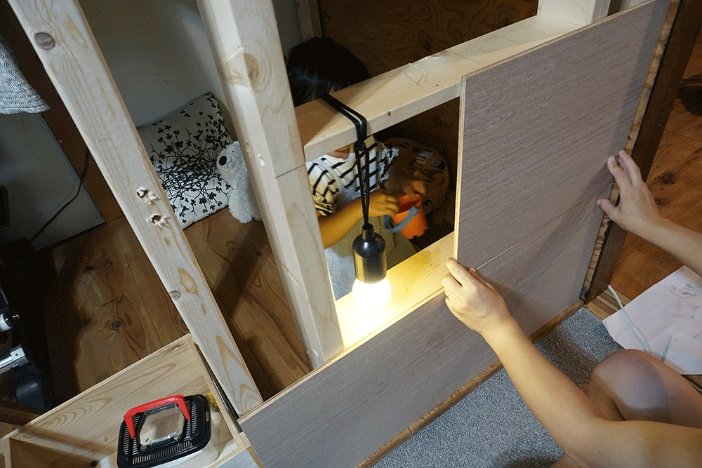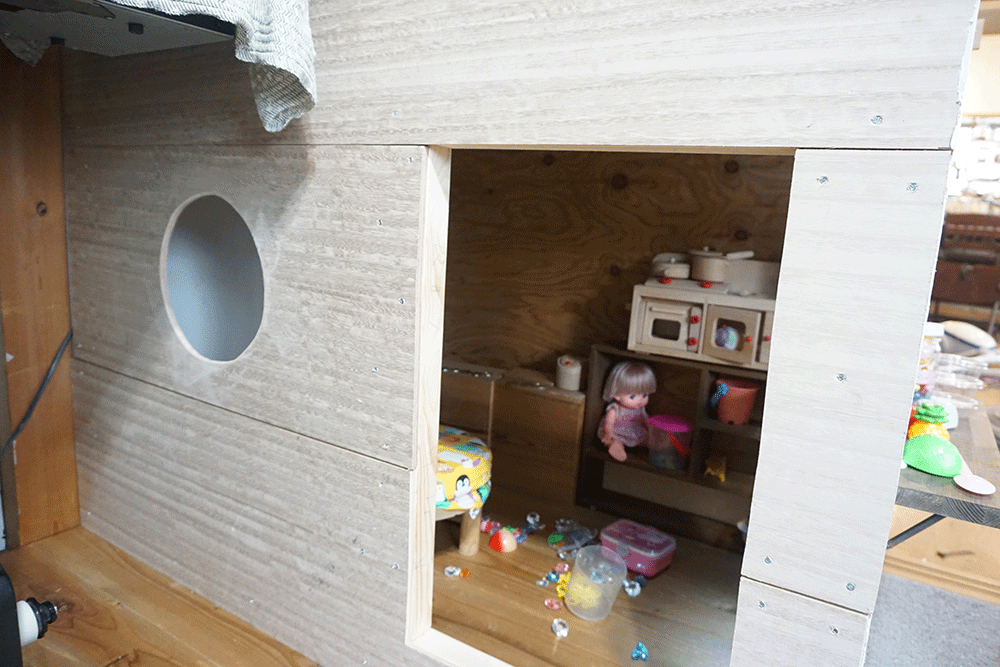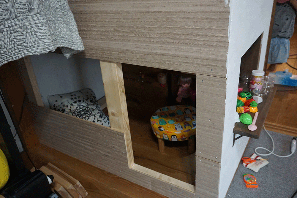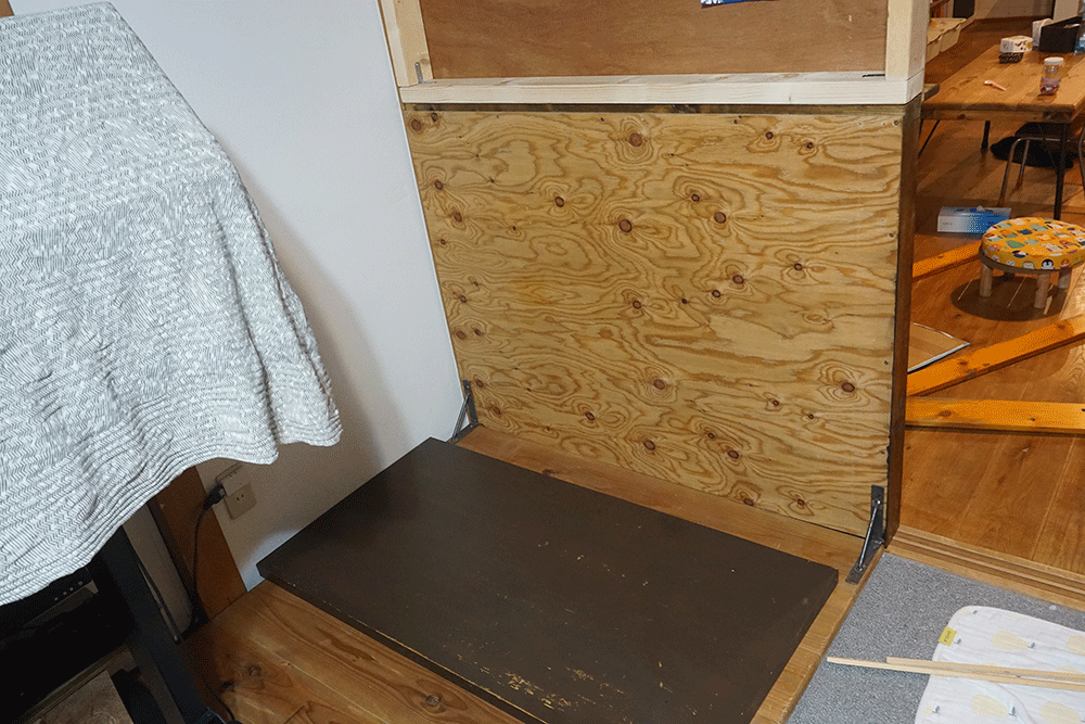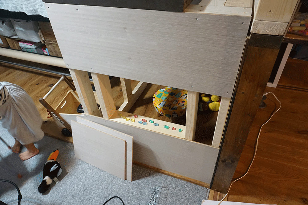 以前製作した黒板裏、ここにちょうど設置できそうなスペースがあるのでここに子ども部屋を建てていきます。