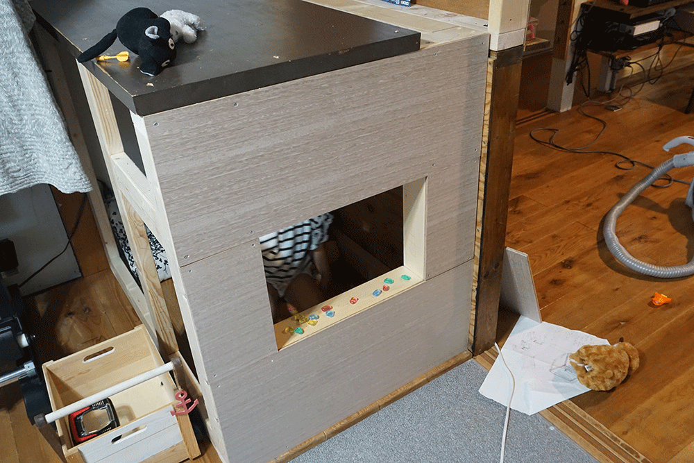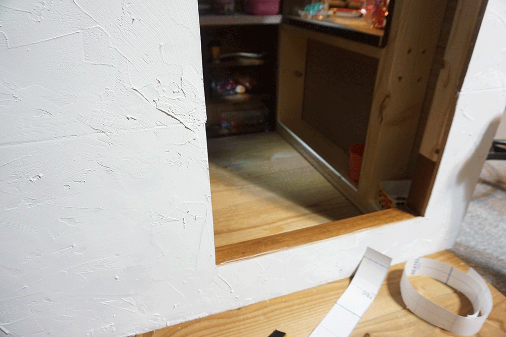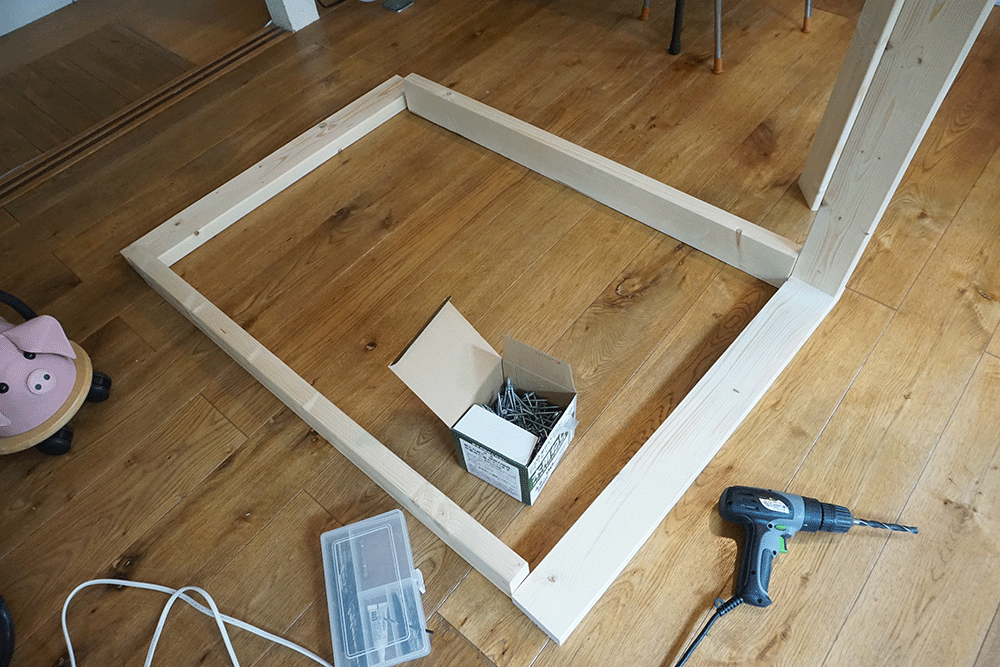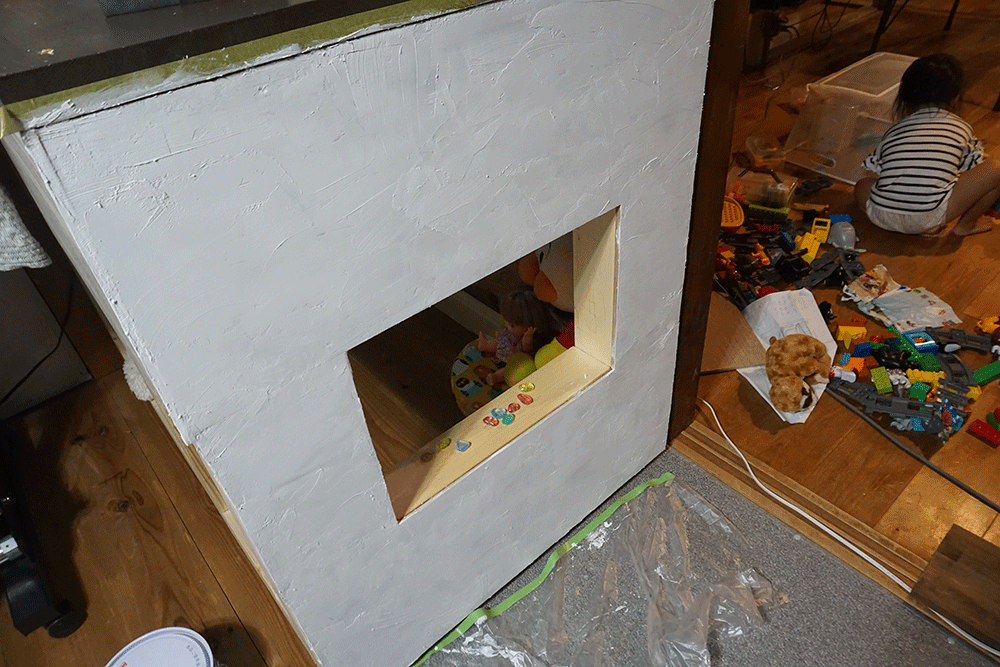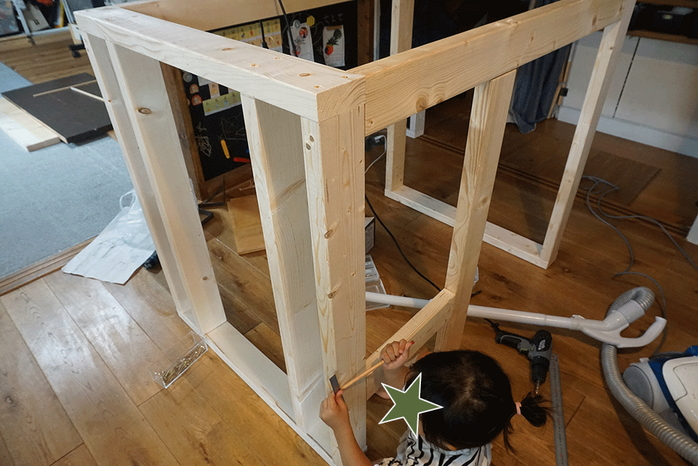以前製作した黒板裏、ここにちょうど設置できそうなスペースがあるのでここに子ども部屋を建てていきます。